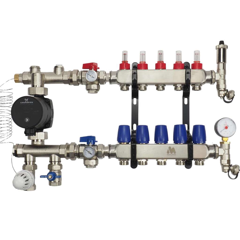Bij deze combinatie wordt de verdeler en pompmodule los geleverd. De module kan eenvoudig op de verdeler worden aangesloten. De LTV module maakt de RVS Open LT verdeler geschikt voor hoog temperatuur systemen. De pomp mengt het warme aanvoerwater vanaf de ketel terug om de juiste temperatuur voor het vloerverwarmingssysteem te verkrijgen. De module is standaard uitgerust met een energiezuinige A-Label pomp, inregelventiel, thermostaatknop en kogelkraan.